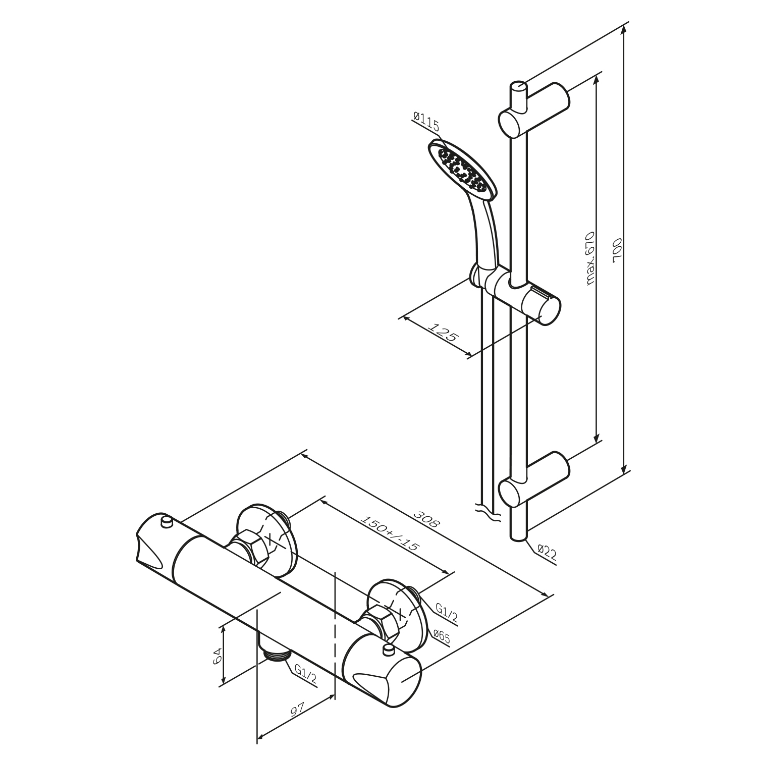An exceptional design combining natural forms and clear lines, perfected by the human mind. A thermostatic cartridge with a highly sensitive element provides reliable anti-scald protection. The faucet is designed for intuitive, effortless operation. The shower set includes a 70 cm rail, a hand shower with 3 spray modes (120 mm diameter), a 175 cm hose, and a soap dish. The hand shower features the Simple Switch push button for convenient use even with pressure fluctuations. The holder is adjustable, and the ball joint protects the hose from twisting. Made from durable chrome-plated brass and eco-friendly ABS plastic; parts are corrosion-resistant and easy to clean thanks to the Rub & Clean function.