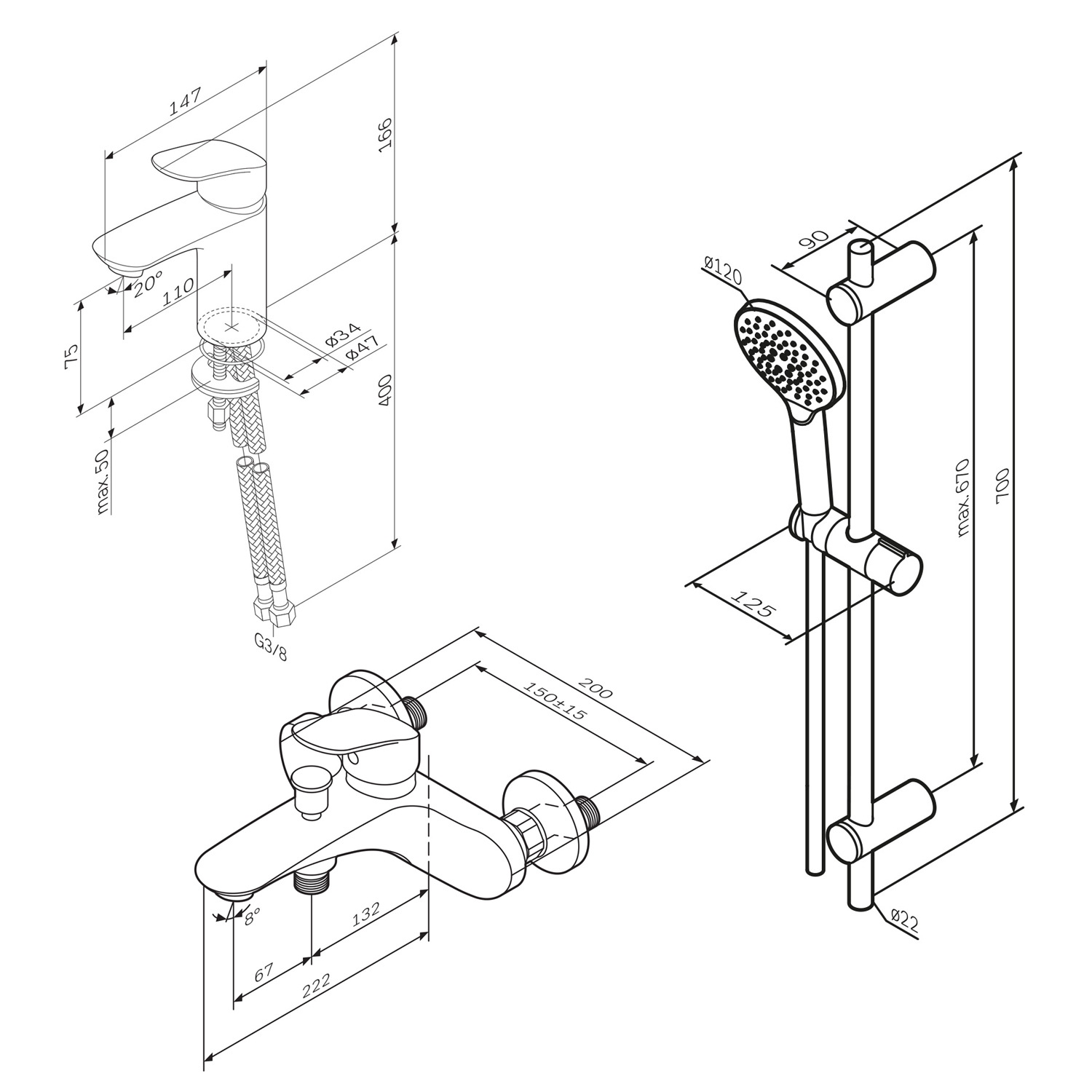 This F409LA00 Hit faucet set consists of an FLA02100 single-lever basin mixer, an FLA10000 bath/shower mixer, and an F01LA000 shower kit – all from solid, high-quality brass. Its modern design ensures contemporary comfort and a unique experience. - FLA02100 Single-lever basin mixer: Material: Brass; Color: Chrome; Dimensions: 170 x 40 x 150 mm; Gross weight: 2.0 kg - FLA10000 Bath/shower mixer: Material: Brass; Color: Chrome; Dimensions: 110 x 200 x 220 mm; Gross weight: 1.92 kg - F01LA000 Shower kit: Material: Stainless steel, ABS plastic; Color: Chrome; Dimensions: 700 x 125 x 130 mm; Gross weight: 0.89 kg
